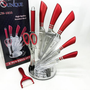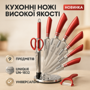Набір ножів UNIQUE UN-1832 з підставкою 9 предметів овочечистка точилка ножиці Нержавіюча стальНабор ножей UNIQUE UN-1832 с подставкой 9 предметов овощечистка точилка ножницы Нержавеющая сталь