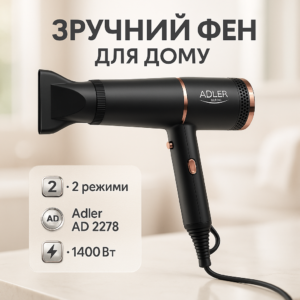 Фен Adler AD 2278 Black 1400Вт 2 швидкості 2 режими іонізація концентратор захист від перегрівуФен Adler AD 2278 Black 1400Вт 2 скорости 2 режима ионизация концентратор защита от перегрева