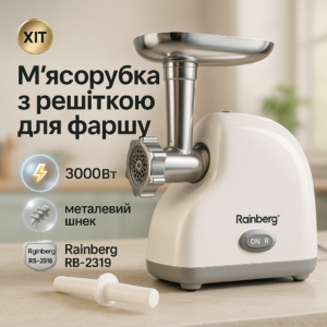 М'ясорубка електрична Rainberg RB-2319 із системою реверсу насадка куббе 3000Вт WhiteМясорубка электрическая Rainberg RB-2319 с системой реверса насадка куббе 3000Вт White