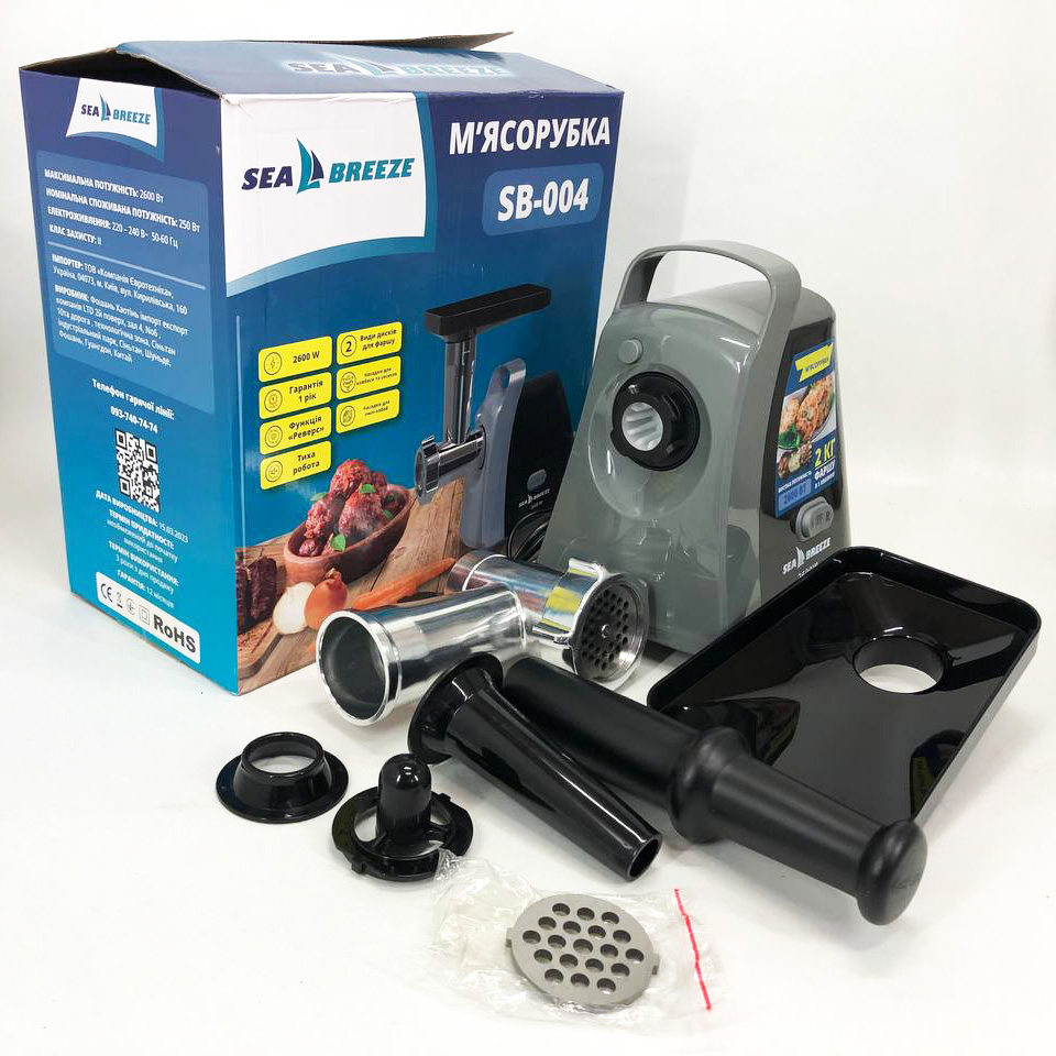 М'ясорубка електрична Sea Breeze SB-004 насадка для ковбас, насадка для люля-кебаб, ніж, штовхач 2600ВтМясорубка электрическая Sea Breeze SB-004 насадка для колбас, насадка для люля-кебаб, нож, толкатель 2600вт