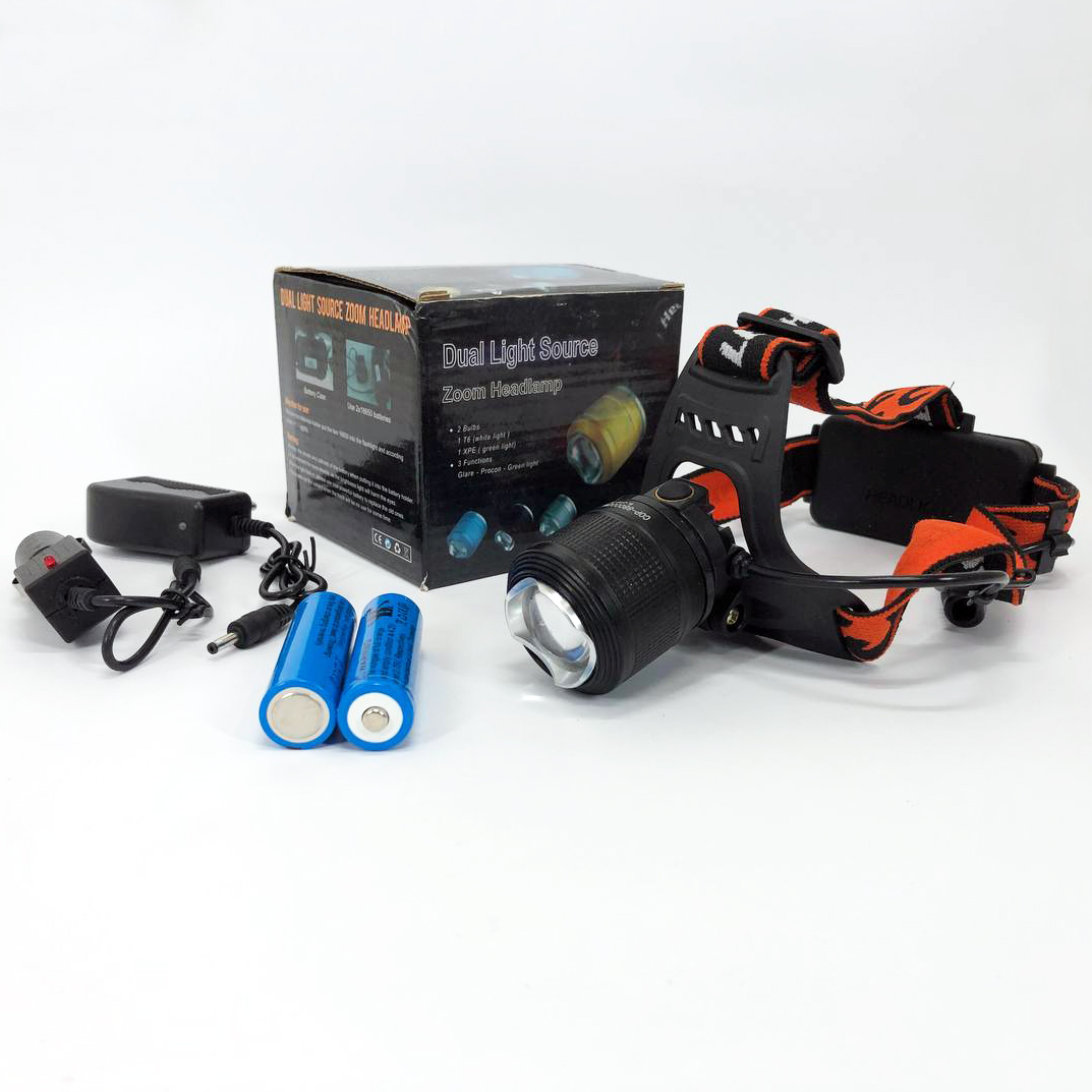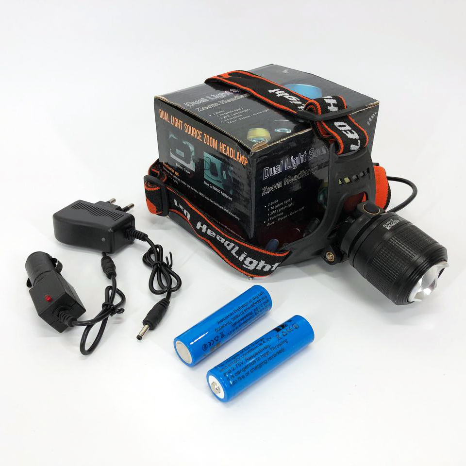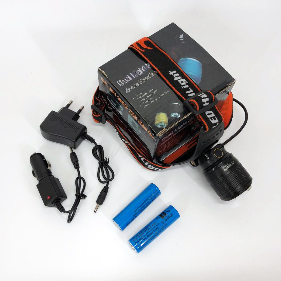 Работает налобный тактический фонарик POLICE BL-2199-T6 от двух аккумуляторов Li-ion 18650 8800 mAh 3.7V, которые располагаются в отдельном блоке, через который их также можно зарядить, в комплекте имеется зарядка от сети 220 и от прикуривателя.