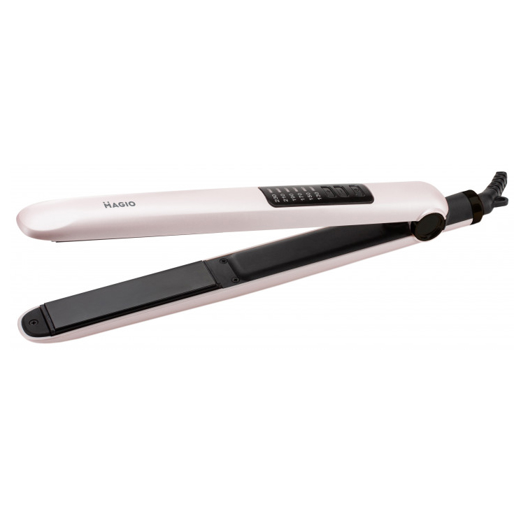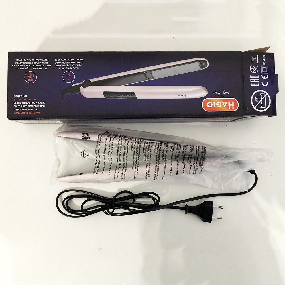 Выпрямитель для волос Magio MG-600 имеет две ключевые особенности – это удобство и элегантность. Модель выполнена в чрезвычайно стильном корпусе и имеет легкий вес. Абсолютная простота – ключевая особенность модели. Материал поверхности рабочих пластин – двухслойная керамика, что влияет не только на конечный результат прически, но и на здоровье волос. Такой вид пластин наносит наименьший вред, быстро и равномерно нагреваются, легко скользят по волосам и предотвращают электризацию. Максимальная мощность прибора – 40 Вт, что способствует быстрому нагреву прибора. А с помощью электронного типа управления, можно выбрать оптимальную температуру для разных типов волос. Петелька для подвешивания и блокировка ручки создают дополнительное удобство при использовании. Вишенкой на торте является плавающая пластина, которая максимально снижает риск повреждения волос.