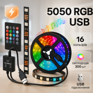Світлодіодна стрічка SMD 5050 RGB LED 2м IP65 з пультом та блоком живлення USB, 2м, Стрічка світлодіодна 5050Светодиодная лента SMD 5050 RGB LED 2м IP65 с пультом и блоком питания USB, 2м, Лента светодиодная 5050