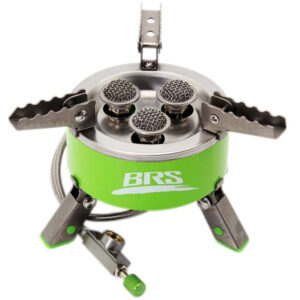 BRS-15 — це газовий пальник нового покоління, який працює на ізобутані і має вітрозахисну конструкцію, що дозволяє збільшити ККД моделі на 35%. Завдяки цій особливості користувач може не брати з собою вітрозахисні екрани та додаткові газові балони — одного картриджа стандартного об'єму вистачає на 2.5 години безперервного горіння, що дозволяє закип'ятити близько 20 літрів води. Ефективність моделі забезпечується не тільки за рахунок вбудованого вітрозахисту, але й наявністю одразу двох шарів із дроту. Вони швидко нагріваються та повільно охолоджуються, заощаджуючи паливо. Пальник працює у трьох режимах із максимальною потужністю 1400 Вт. З його допомогою можна готувати страви з нуля, розігрівати напівфабрикати, заварювати улюблені напої та смажити м'ясо чи овочі барбекю. Безпечна конструкція також передбачає використання аксесуара в якості портативного інфрачервоного обігрівача, який продовжує працювати і не призводить до займання близько розташованих предметів навіть при падінні на бік. Газовий балон підключається до пальника за допомогою металевого шлангу із різьбовим з'єднанням на кінці. Після використання з'єднання щільно закривається заглушкою, щоб запобігти потраплянню всередину забруднень — частої причини займання при повторному під'єднанні картриджа. Конструкція BRS-15 оснащена складаними стійками для встановлення посуду та трьома ніжками. Поверхня стійок покрита дрібними зубчиками, що зменшують ковзання посуду під час кулінарних експериментів, а ніжки доповнені прогумованими вставками, щоб надати пальнику більшої стійкості. Газовий пальник BRS-15 сконструйований з упором не тільки на ефективність, але і на довговічність. У ніьому використані удароміцні та зносостійкі метали, як нержавіюча сталь та мідь. Обидва матеріали протистоять іржавінню навіть при регулярному контакті з вологою і не деформуються при терті чи ударі о тверду поверхню. Вага конструкції складає 313 грамів. Характеристики: похідний газовий пальник для приготування їжі та обігріву в польових умовах; матеріали – нержавіюча сталь, мідь; три режими роботи; максимальна потужність – 1400 Вт; тип палива – ізобутан; дротяна сітка з двох шарів (швидко нагрівається та повільно остигає, економлячи паливо); ефективна вітрозахисна конструкція; прогумовані складані ніжки; вага – 313 грамів.
