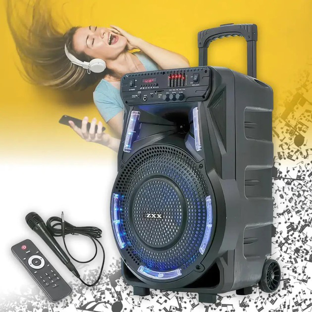 Професійна акумуляторна акустична система ZXX-1011 800 Вт 15" зі світломузикою та мікрофонамиПрофессиональная аккумуляторная акустическая система ZXX-1011 800 Вт 15″ со светомузыкой и микрофонами