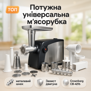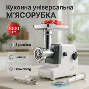 Електром'ясорубка Crownberg CB-4216 3200Вт м'ясорубка соковитискач з терками для овочів та реверсомЭлектромясорубка Crownberg CB-4216 3200Вт мясорубка соковыжималка с терками для овощей и реверсом