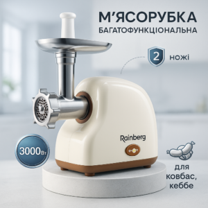 М'ясорубка електрична Rainberg RB-2319 із системою реверсу насадка куббе 3000Вт BeigeМясорубка электрическая Rainberg RB-2319 с системой реверса насадка куббе 3000Вт Beige