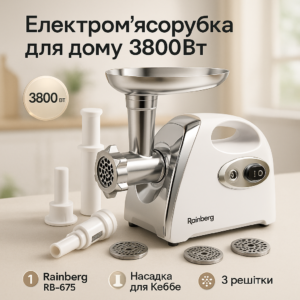 М'ясорубка Rainberg RB-675 3800Вт із соковижималкою, електрична з насадками для шатківниці WhiteМясорубка Rainberg RB-675 3800Вт с соковыжималкой, электрическая с насадками для шинковки White