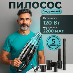 Потужний бездротовий пилосос автомобільний для сухого та вологого прибирання в машині та будинку +5 насадокМощный беспроводной пылесос автомобильный для сухой и влажной уборки в машине и дома +5 насадок