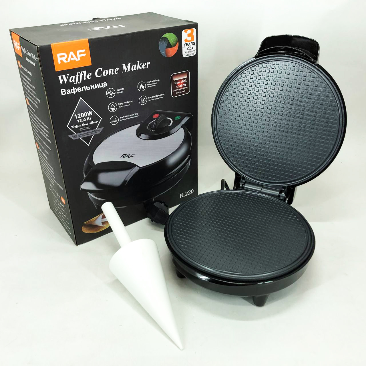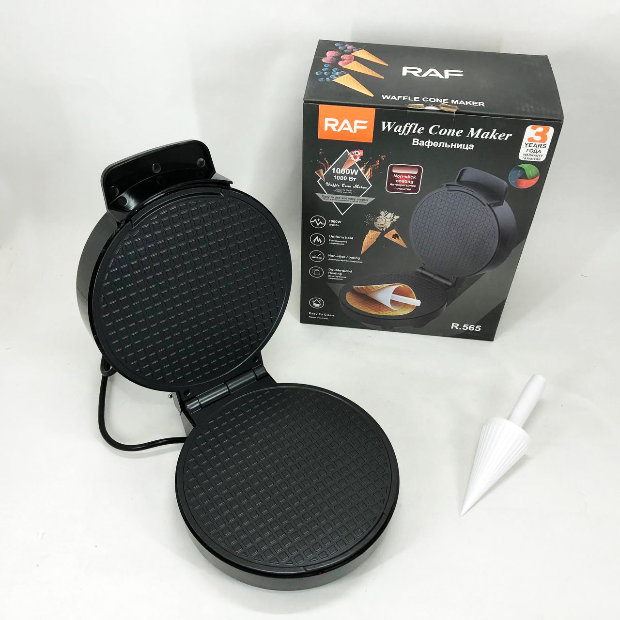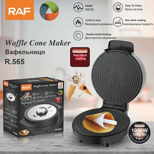 Електрична вафельниця RAF R.565 з антипригарним покриттям та конусом для трубочокЭлектрическая вафельница RAF R.565 с антипригарным покрытием и конусом для трубочек